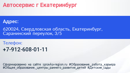 Автосервис, г. Екатеринбург по адресу 620024, Свердловская область, Екатеринбург, Саранинский переулок, 3/5 в дальнейшем Организация, размещена в следующих категориях: