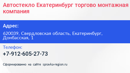 Автостекло Екатеринбург, торгово-монтажная компания по адресу 620039, Свердловская область, Екатеринбург, Донбасская, 1 в дальнейшем Организация, размещена в следующих категориях: