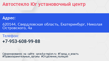 Автостекло-Юг, установочный центр по адресу 620144, Свердловская область, Екатеринбург, Николая Островского, 4а в дальнейшем Организация, размещена в следующих категориях: