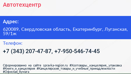 Автотехцентр по адресу 620089, Свердловская область, Екатеринбург, Луганская, 59/1ж в дальнейшем Организация, размещена в следующих категориях: