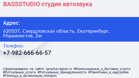 BASSSTUDIO, студия автозвука по адресу 620107, Свердловская область, Екатеринбург, Машинистов, 2ж в дальнейшем Организация, размещена в следующих категориях: