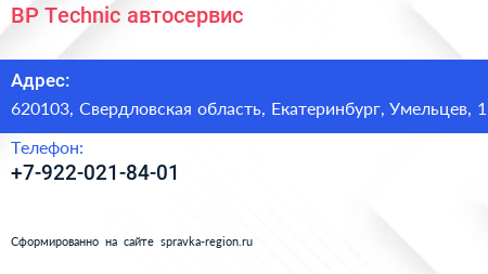 BP-Technic, автосервис по адресу 620103, Свердловская область, Екатеринбург, Умельцев, 1 в дальнейшем Организация, размещена в следующих категориях: