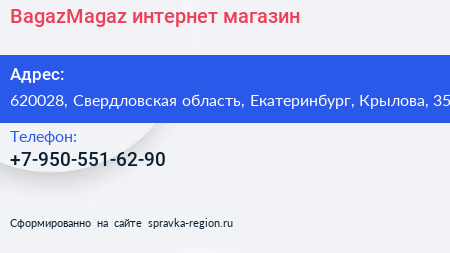 BagazMagaz, интернет-магазин по адресу 620028, Свердловская область, Екатеринбург, Крылова, 35 в дальнейшем Организация, размещена в следующих категориях: