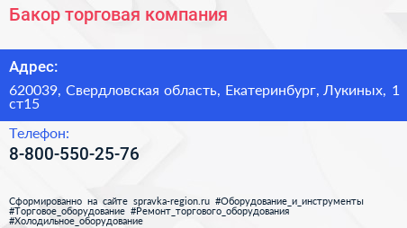 Бакор, торговая компания по адресу 620039, Свердловская область, Екатеринбург, Лукиных, 1 ст15 в дальнейшем Организация, размещена в следующих категориях: