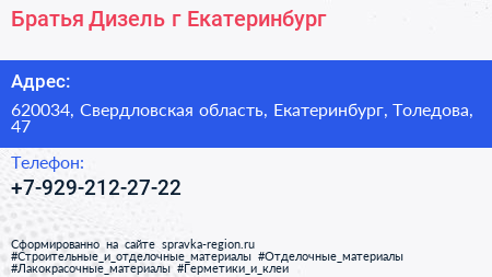 Братья Дизель, г. Екатеринбург по адресу 620034, Свердловская область, Екатеринбург, Толедова, 47 в дальнейшем Организация, размещена в следующих категориях: