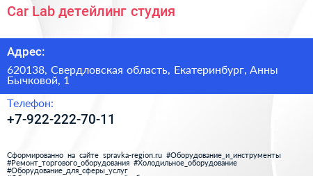 Car Lab, детейлинг-студия по адресу 620138, Свердловская область, Екатеринбург, Анны Бычковой, 1 в дальнейшем Организация, размещена в следующих категориях: