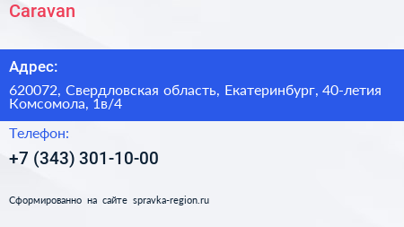 Caravan по адресу 620072, Свердловская область, Екатеринбург, 40-летия Комсомола, 1в/4 в дальнейшем Организация, размещена в следующих категориях: