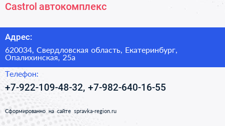 Castrol, автокомплекс по адресу 620034, Свердловская область, Екатеринбург, Опалихинская, 25а в дальнейшем Организация, размещена в следующих категориях: