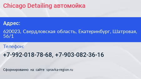 Chicago Detailing, автомойка по адресу 620023, Свердловская область, Екатеринбург, Шатровая, 56/1 в дальнейшем Организация, размещена в следующих категориях: