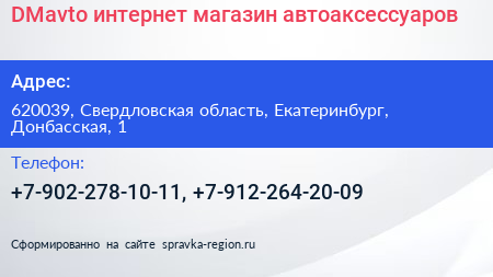 DMavto, интернет-магазин автоаксессуаров по адресу 620039, Свердловская область, Екатеринбург, Донбасская, 1 в дальнейшем Организация, размещена в следующих категориях: