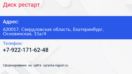Диск рестарт по адресу 620017, Свердловская область, Екатеринбург, Основинская, 15а/4 в дальнейшем Организация, размещена в следующих категориях: