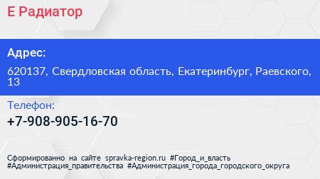 Е-Радиатор по адресу 620137, Свердловская область, Екатеринбург, Раевского, 13 в дальнейшем Организация, размещена в следующих категориях: