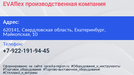 EVAflex, производственная компания по адресу 620141, Свердловская область, Екатеринбург, Майкопская, 10 в дальнейшем Организация, размещена в следующих категориях:
