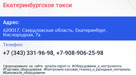 Екатеринбургское такси по адресу 620017, Свердловская область, Екатеринбург, Кислородная, 7а в дальнейшем Организация, размещена в следующих категориях: