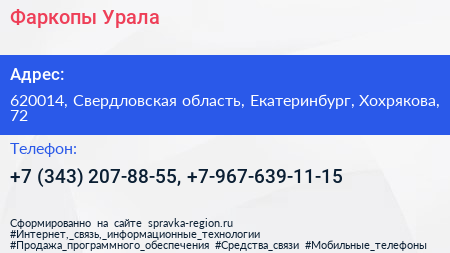 Фаркопы Урала по адресу 620014, Свердловская область, Екатеринбург, Хохрякова, 72 в дальнейшем Организация, размещена в следующих категориях: