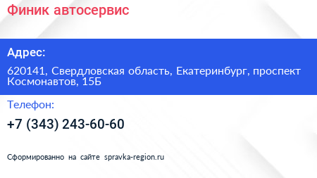 Финик, автосервис по адресу 620141, Свердловская область, Екатеринбург, проспект Космонавтов, 15Б в дальнейшем Организация, размещена в следующих категориях: