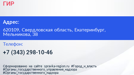 ГИР по адресу 620109, Свердловская область, Екатеринбург, Мельникова, 38 в дальнейшем Организация, размещена в следующих категориях: