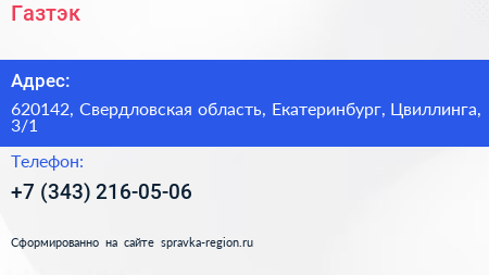 Газтэк по адресу 620142, Свердловская область, Екатеринбург, Цвиллинга, 3/1 в дальнейшем Организация, размещена в следующих категориях: