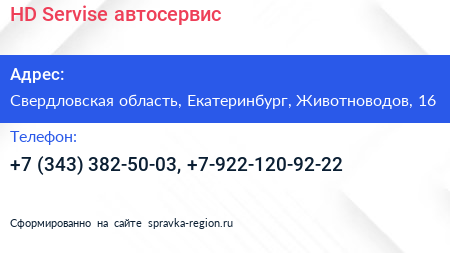 HD Servise, автосервис по адресу Свердловская область, Екатеринбург, Животноводов, 16 в дальнейшем Организация, размещена в следующих категориях: