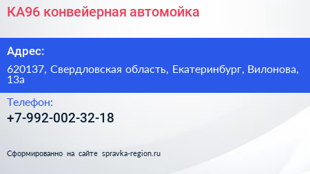 КА96, конвейерная автомойка по адресу 620137, Свердловская область, Екатеринбург, Вилонова, 13а в дальнейшем Организация, размещена в следующих категориях:
