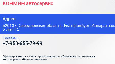 КОНМИН, автосервис по адресу 620137, Свердловская область, Екатеринбург, Аппаратная, 5 лит Т1 в дальнейшем Организация, размещена в следующих категориях: