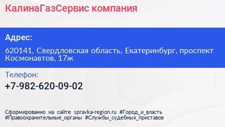 КалинаГазСервис, компания по адресу 620141, Свердловская область, Екатеринбург, проспект Космонавтов, 17ж в дальнейшем Организация, размещена в следующих категориях: