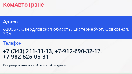 КомАвтоТранс по адресу 620057, Свердловская область, Екатеринбург, Совхозная, 20Б в дальнейшем Организация, размещена в следующих категориях: