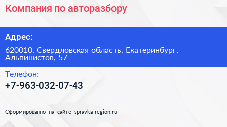 Компания по авторазбору по адресу 620010, Свердловская область, Екатеринбург, Альпинистов, 57 в дальнейшем Организация, размещена в следующих категориях: