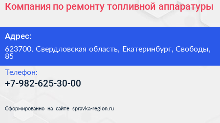 Компания по ремонту топливной аппаратуры по адресу 623700, Свердловская область, Екатеринбург, Свободы, 85 в дальнейшем Организация, размещена в следующих категориях: