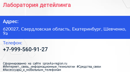 Лаборатория детейлинга по адресу 620027, Свердловская область, Екатеринбург, Шевченко, 9а в дальнейшем Организация, размещена в следующих категориях:
