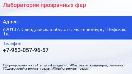 Лаборатория прозрачных фар по адресу 620137, Свердловская область, Екатеринбург, Шефская, 1д в дальнейшем Организация, размещена в следующих категориях:
