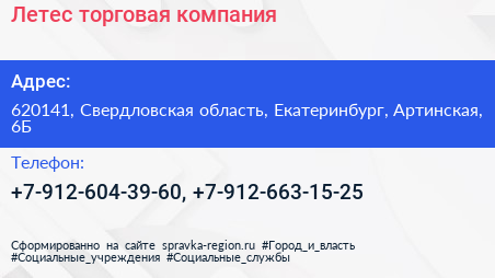 Летес, торговая компания по адресу 620141, Свердловская область, Екатеринбург, Артинская, 6Б в дальнейшем Организация, размещена в следующих категориях: