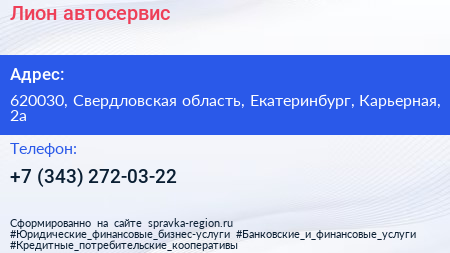 Лион, автосервис по адресу 620030, Свердловская область, Екатеринбург, Карьерная, 2а в дальнейшем Организация, размещена в следующих категориях: