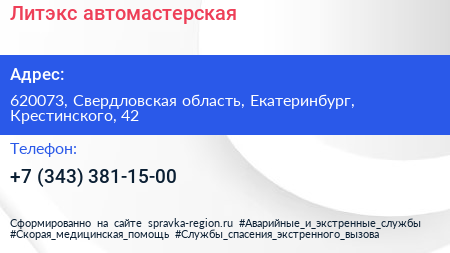 Литэкс, автомастерская по адресу 620073, Свердловская область, Екатеринбург, Крестинского, 42 в дальнейшем Организация, размещена в следующих категориях: