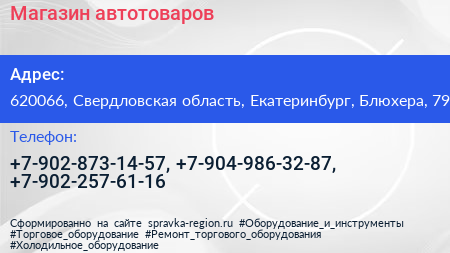 Магазин автотоваров по адресу 620066, Свердловская область, Екатеринбург, Блюхера, 79 в дальнейшем Организация, размещена в следующих категориях: