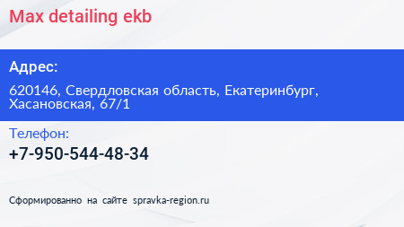 Max detailing ekb по адресу 620146, Свердловская область, Екатеринбург, Хасановская, 67/1 в дальнейшем Организация, размещена в следующих категориях: