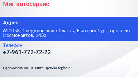 Миг, автосервис по адресу 620058, Свердловская область, Екатеринбург, проспект Космонавтов, 145а в дальнейшем Организация, размещена в следующих категориях:
