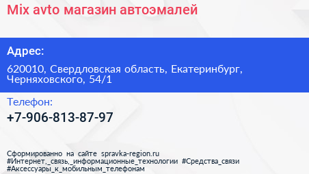 Mix-avto, магазин автоэмалей по адресу 620010, Свердловская область, Екатеринбург, Черняховского, 54/1 в дальнейшем Организация, размещена в следующих категориях:
