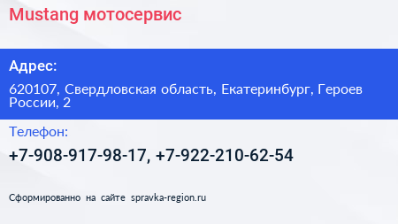 Mustang, мотосервис по адресу 620107, Свердловская область, Екатеринбург, Героев России, 2 в дальнейшем Организация, размещена в следующих категориях: