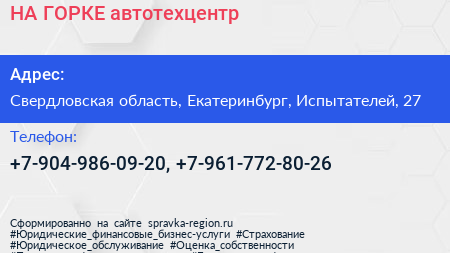 НА ГОРКЕ, автотехцентр по адресу Свердловская область, Екатеринбург, Испытателей, 27 в дальнейшем Организация, размещена в следующих категориях: