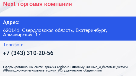 Next, торговая компания по адресу 620141, Свердловская область, Екатеринбург, Армавирская, 17 в дальнейшем Организация, размещена в следующих категориях: