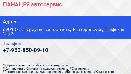 ПАНАЦЕЯ, автосервис по адресу 620137, Свердловская область, Екатеринбург, Шефская, 2Б/2 в дальнейшем Организация, размещена в следующих категориях: