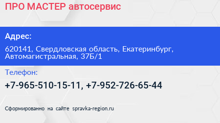 ПРО-МАСТЕР, автосервис по адресу 620141, Свердловская область, Екатеринбург, Автомагистральная, 37Б/1 в дальнейшем Организация, размещена в следующих категориях: