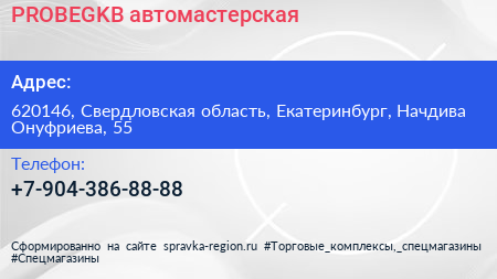 PROBEGKB, автомастерская по адресу 620146, Свердловская область, Екатеринбург, Начдива Онуфриева, 55 в дальнейшем Организация, размещена в следующих категориях: