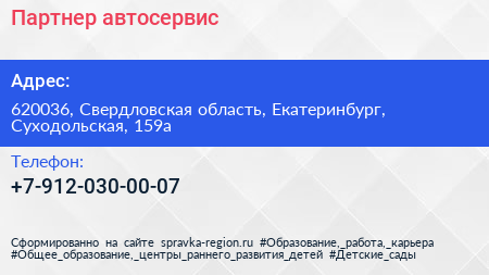 Партнер, автосервис по адресу 620036, Свердловская область, Екатеринбург, Суходольская, 159а в дальнейшем Организация, размещена в следующих категориях: