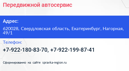 Передвижной автосервис по адресу 620028, Свердловская область, Екатеринбург, Нагорная, 49/1 в дальнейшем Организация, размещена в следующих категориях: