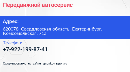 Передвижной автосервис по адресу 620078, Свердловская область, Екатеринбург, Комсомольская, 71а в дальнейшем Организация, размещена в следующих категориях: