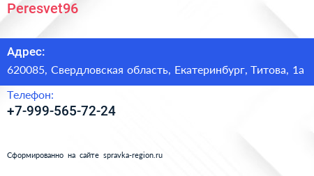 Peresvet96 по адресу 620085, Свердловская область, Екатеринбург, Титова, 1а в дальнейшем Организация, размещена в следующих категориях: