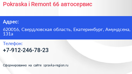 Pokraska i Remont 66, автосервис по адресу 620016, Свердловская область, Екатеринбург, Амундсена, 131а в дальнейшем Организация, размещена в следующих категориях: