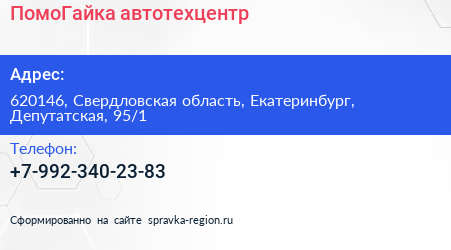 ПомоГайка, автотехцентр по адресу 620146, Свердловская область, Екатеринбург, Депутатская, 95/1 в дальнейшем Организация, размещена в следующих категориях:
